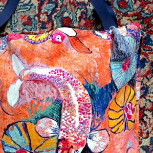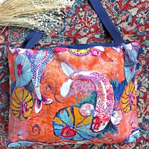Très emblématiques, les carpes Koï japonaises, ici dessinées par la créatrice Marie-Adeline Riche, nous offrent un véritable tableau transposé sur du velours.