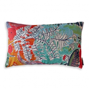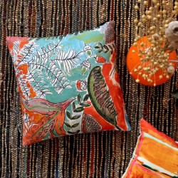 Ce tissu fait partie d’un univers faisant référence à l’exotisme, thème cher à la créatrice. Cet imprimé est une évocation végétale dans une palette aux couleurs vitaminées.