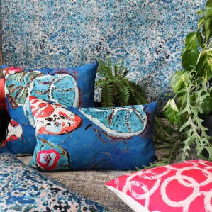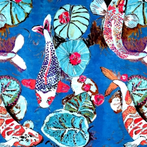 Très emblématiques, les carpes Koï japonaises, ici dessinées par la créatrice Marie-Adeline Riche, nous offrent un véritable tableau transposé sur du velours.