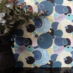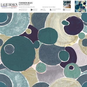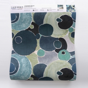 Motif géométrique et distingué décrivant des cercles qui valsent les uns avec les autres. C’est par sa palette aqua, aux rythmes enjoués, que ce tissu fait voyager.