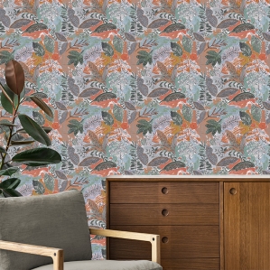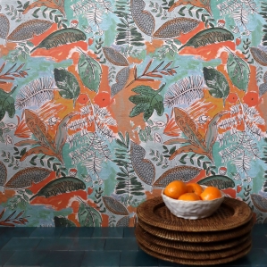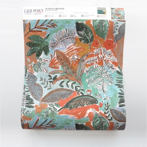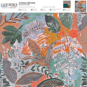 Ce tissu fait partie d’un univers faisant référence à l’exotisme, thème cher à la créatrice. Cet imprimé est une évocation végétale dans une palette aux couleurs vitaminées.